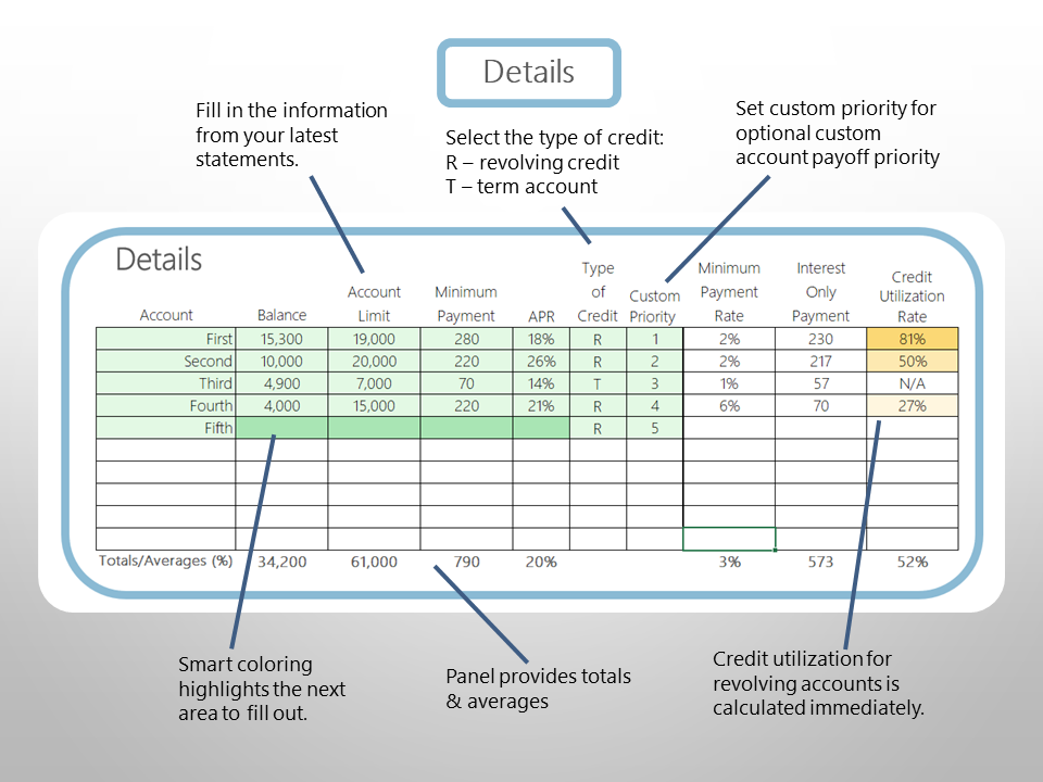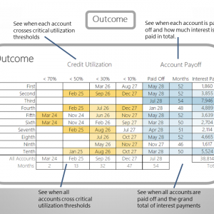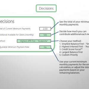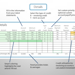 This tool plans out your debt payoff with all the standard options, Snowball (smallest balance), Avalanche (highest APR), largest balance, custom priority, but now a new method. Credit Score Focus™ plans payments around the key thresholds of credit utilization that the credit bureaus are watching for. 70%, 50%, 30% and 10%. Simply load in your account information and select Credit Score Method. The tool recalculates the account ranking based on credit utilization (each month) and puts your additional debt payment where it can have the biggest effect on that threshold. The tool shows the date of your next milestone, and estimates the expected credit score improvement. There is no more advanced debt payoff sheet out there, and there is no faster way to improve your credit score while paying off your debt.