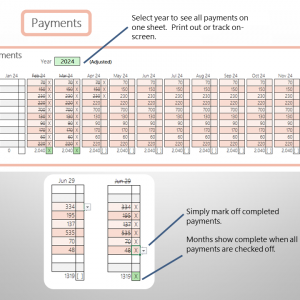 • Payment Tracker for any year in the plan, can be printed and written on or checked off on-screen.